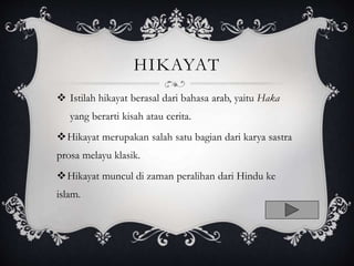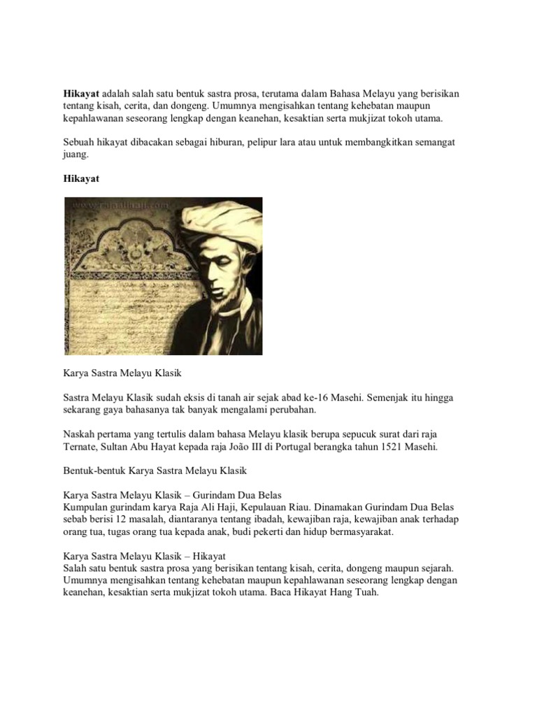 Sastra Melayu Klasik Hikayat kelas X 2020 Direktorat SMA Direktorat Jendral PAUD DIKDAS dan DIKMEN Melestarikan Nilai Kearifan Lokal Melalui Cerita Rakyat Hikayat berdasarkan kutipan tersebut yang termasuk ciri-ciri atau karakteristik karya sastra Melayu Klasik. Hikayat adalah salah satu bentuk sastra prosa yang berisikan tentang kisah cerita dongeng maupun sejarah. Contoh Hikayat Melayu Hikayat adalah bentuk sastra prosa terutama dalam bahasa Melayu yang berisi cerita cerita pendek hukum sejarah fiksi kepahlawanan agama dan dongeng.