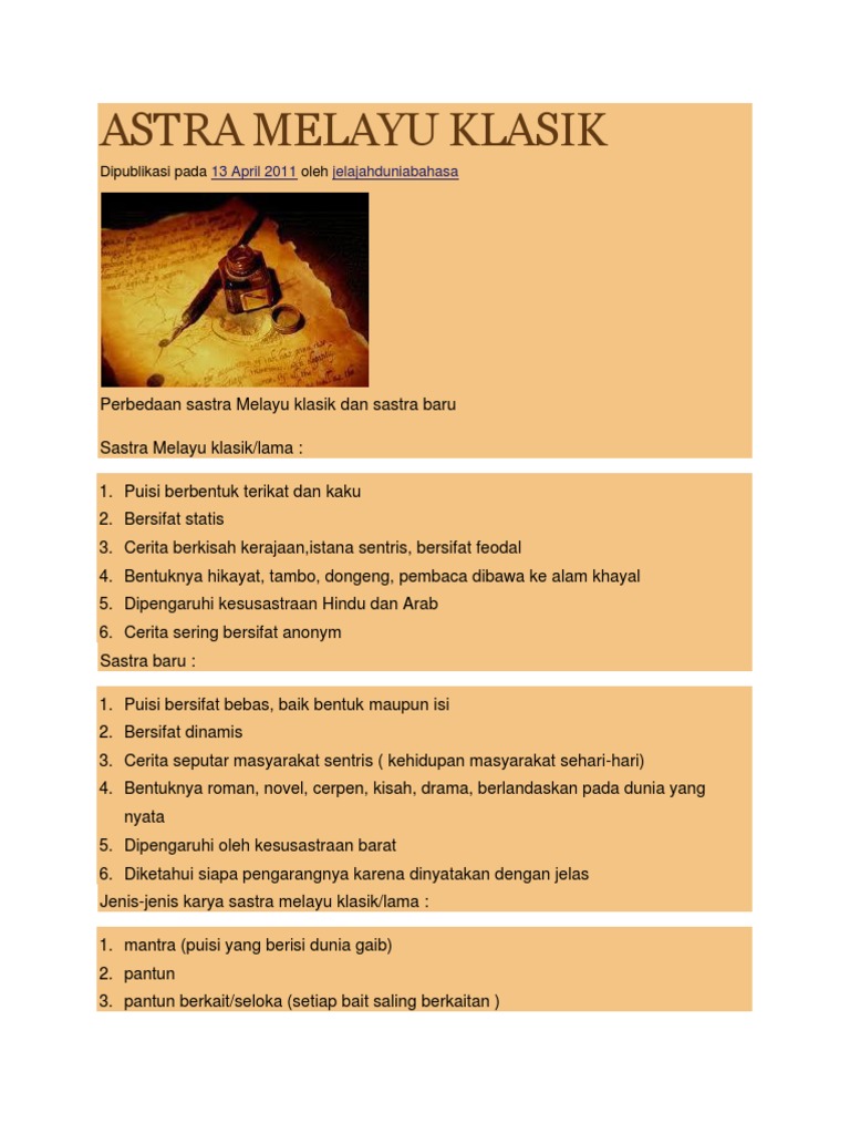 Nama penciptanya biasanya tidak diketahui anonim Karya sastra melayu klasik bersifat anonim atau tidak diketahui siapa pengarangnya. Menggunakan bahasa Melayu 9. Sastra Melayu Klasik adalah sastra lama yang lahir pada masyarakat lama atau tradisional yakni suatu masyarakat yang masih sederhana dan terikat oleh adat istiadat.